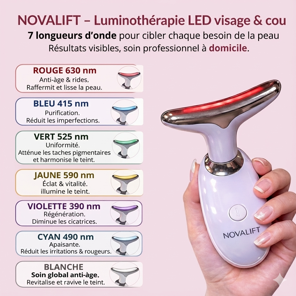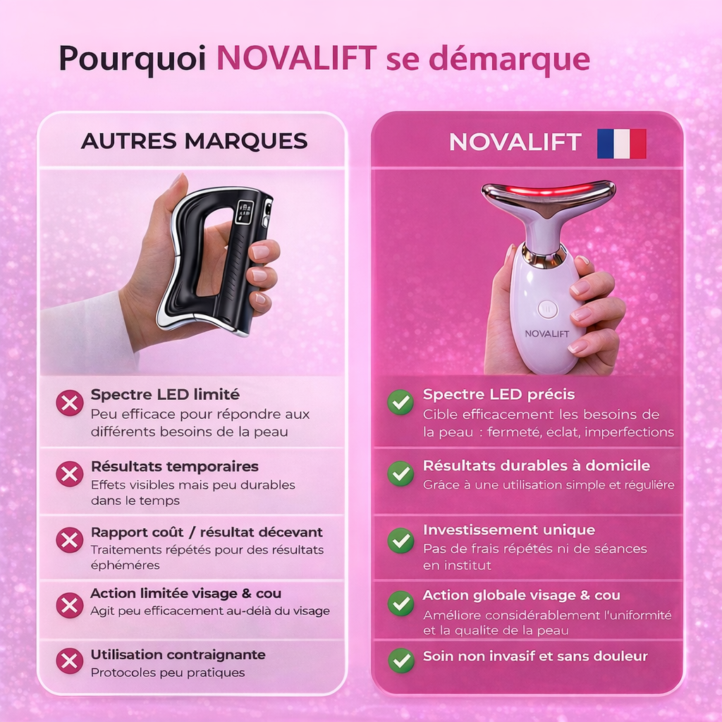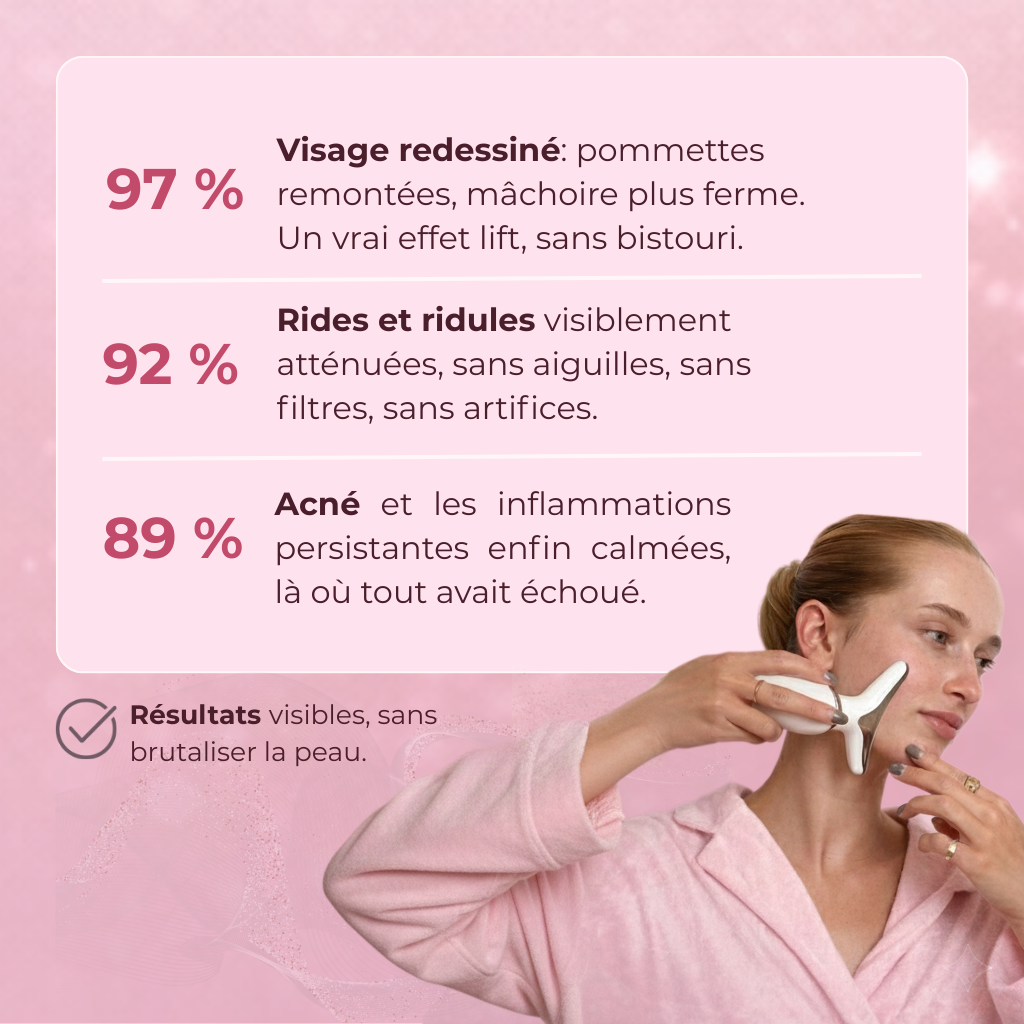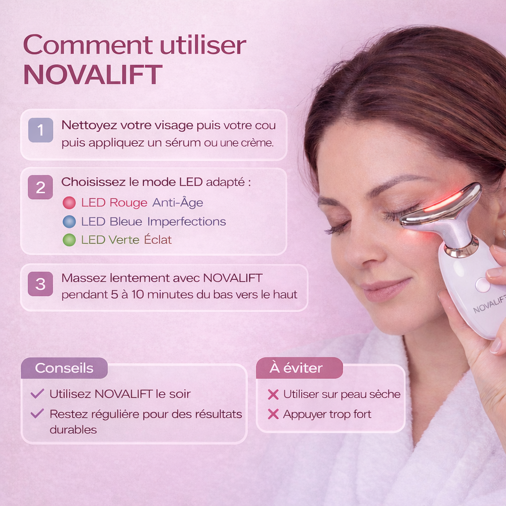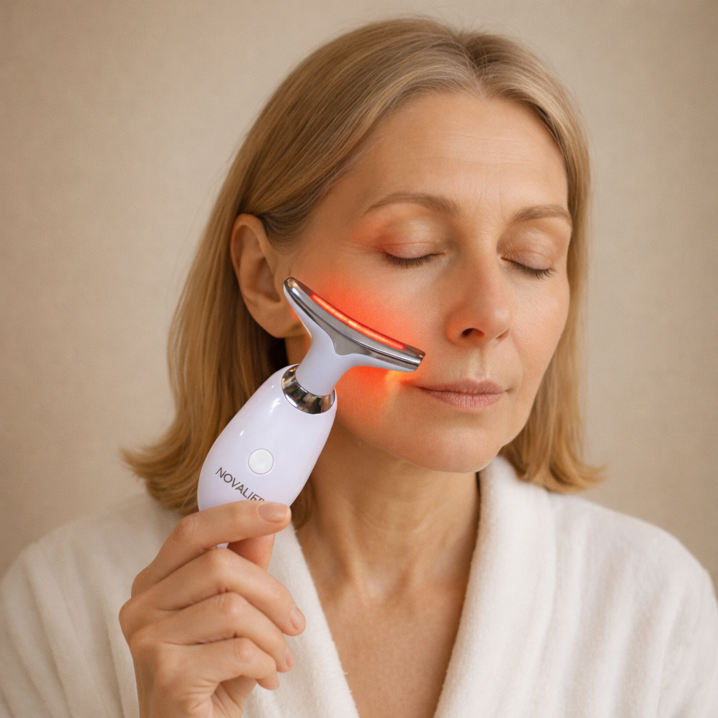 Avec NOVALIFT, profitez d’un soin complet pour une peau plus lisse, lumineuse et un visage visiblement redéfini, directement depuis chez vous.